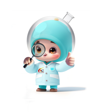 元素阐释:IP形象以卡通化的表现形式呈现,整体采用流线型设计,头身比例为1:1。头部外置工业经典元素透明圆形烧瓶,象征着知识与智慧、蕴含着无限可能。身穿蓝色连帽衫,外套为白色化学实验服,衣服左上方为“工”字样,右上方为学校60周年校庆LOGO。人物右手持黑色放大镜,象征着对知识的渴望与探索精神;左手竖起大拇指,表达了对学校教育教学质量的认可与自信。脸部的大眼睛明亮有神,脸颊上的红晕展现出纯真与活力,微笑的表情传递出友好与自信,让人感受到“工小宝”的亲和力与正能量。